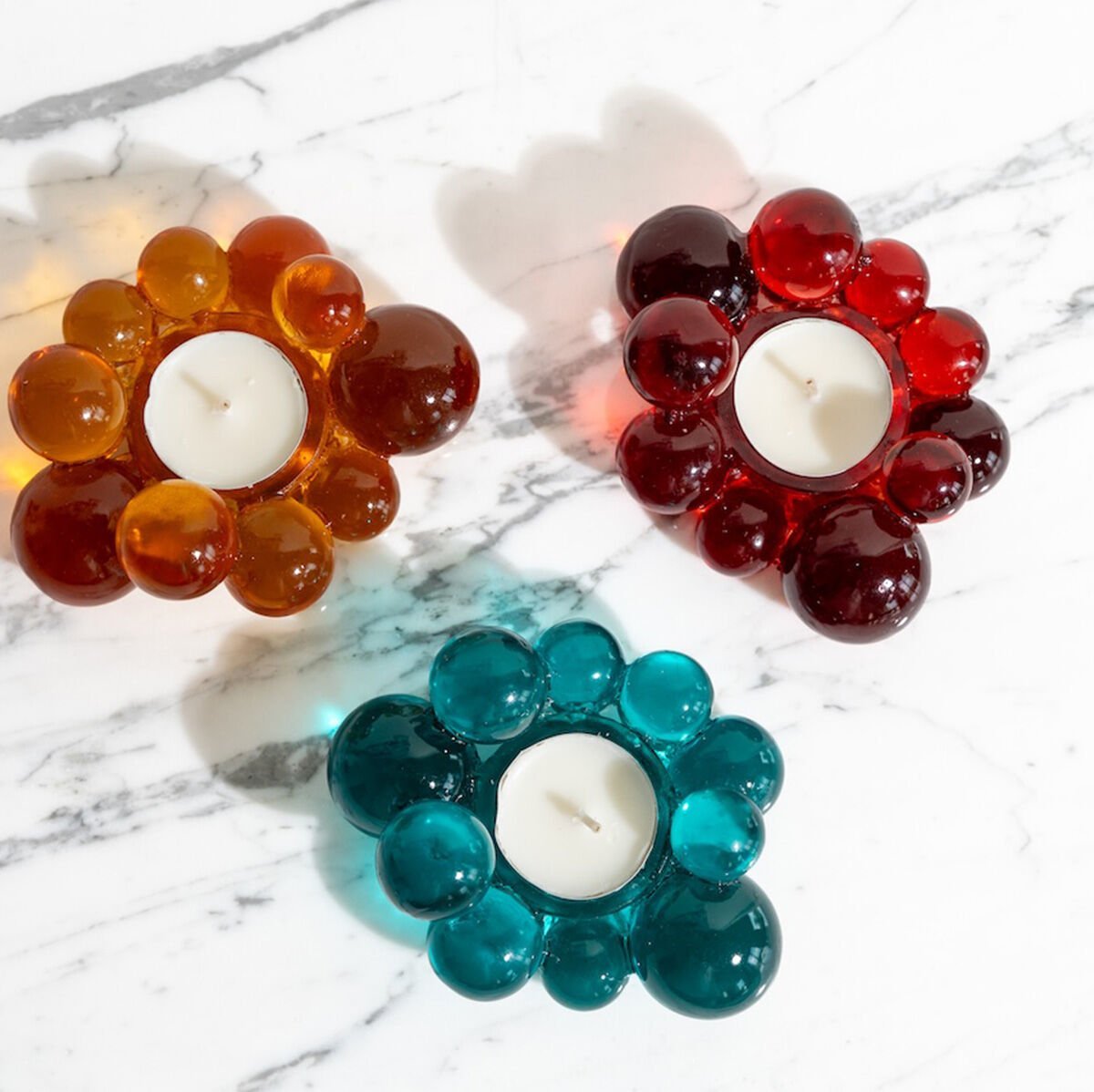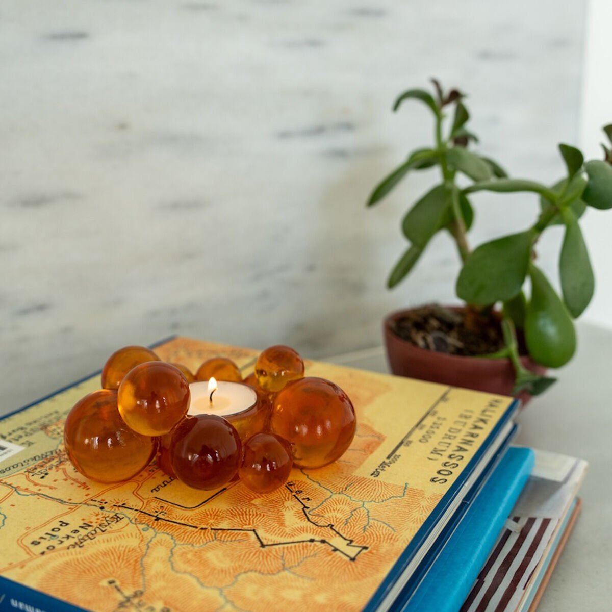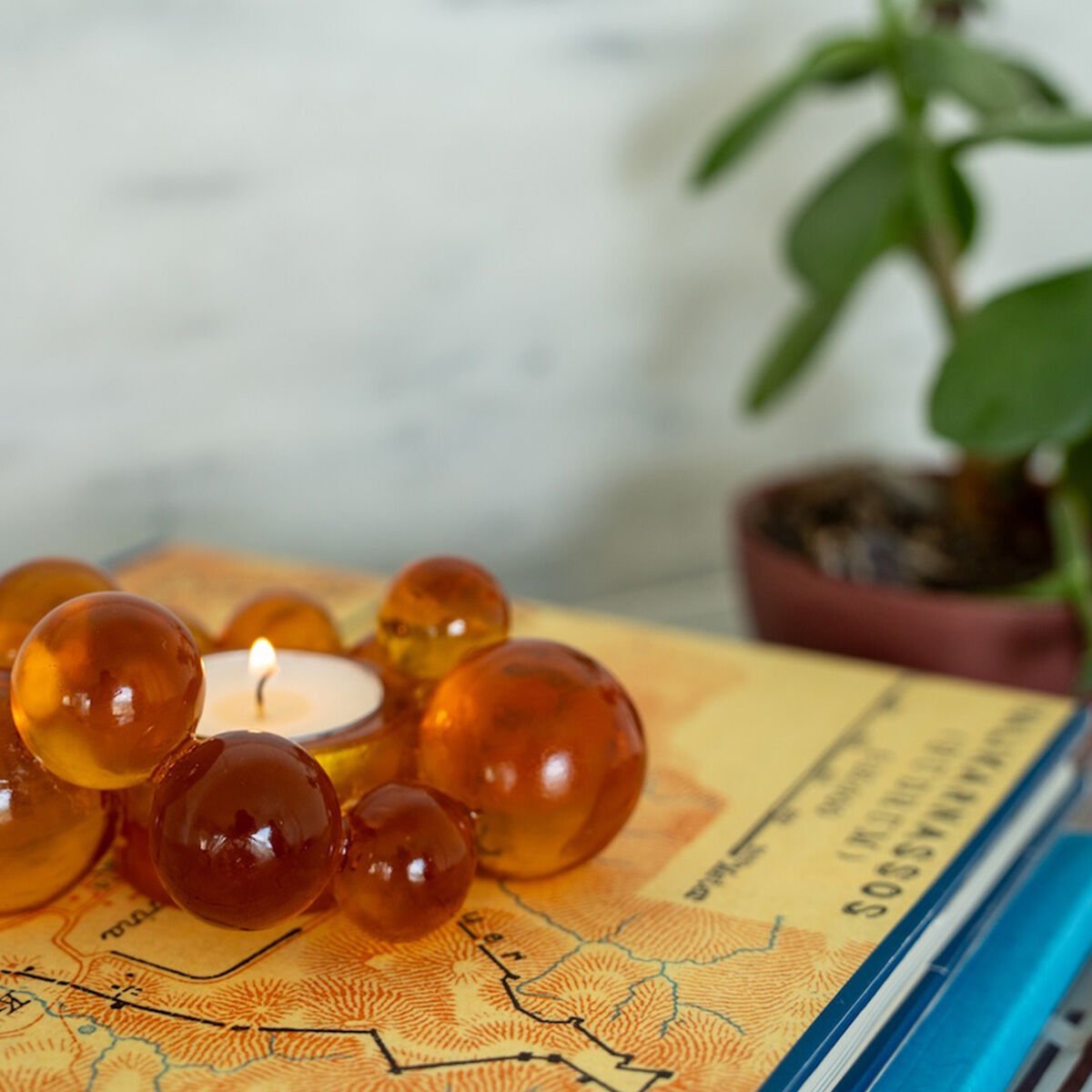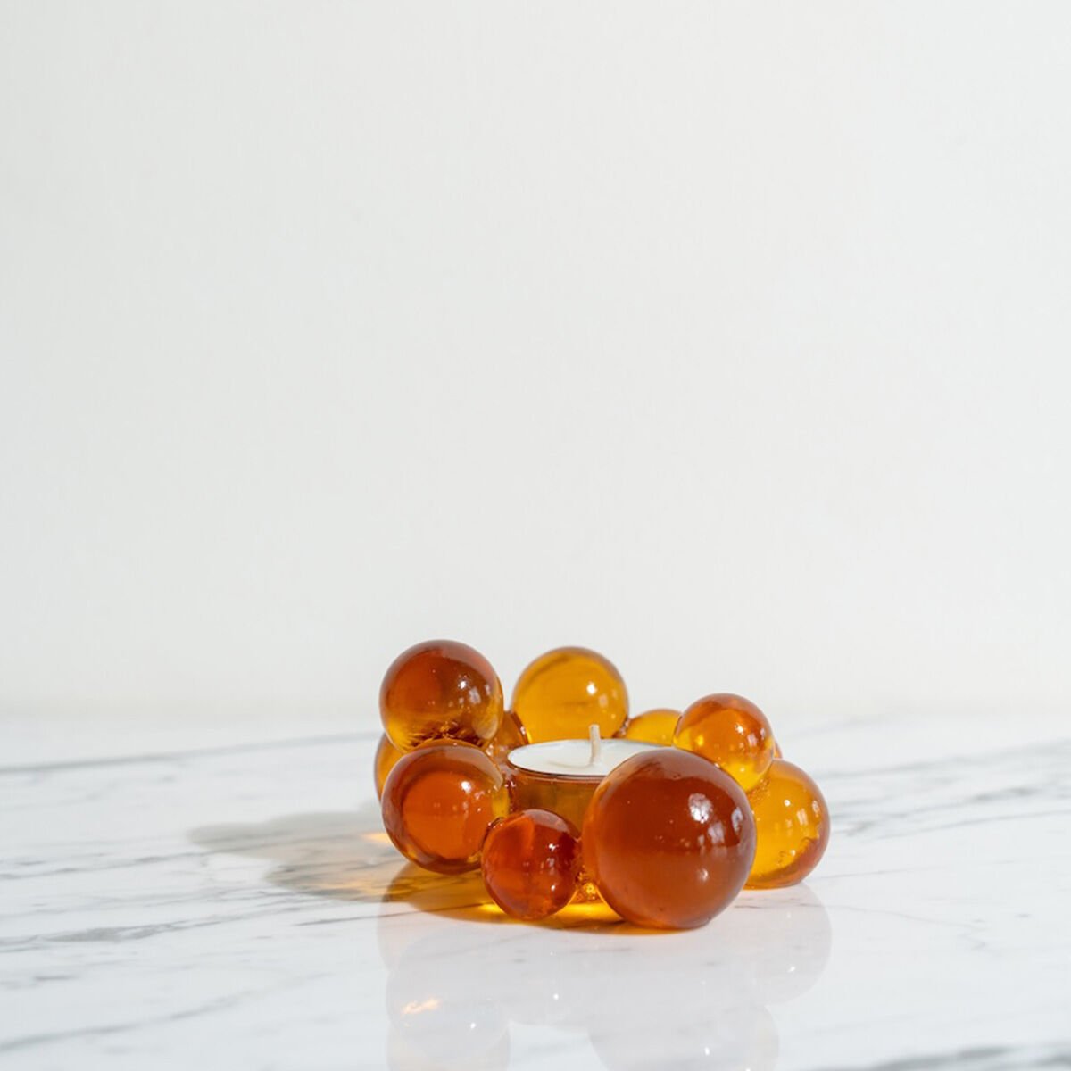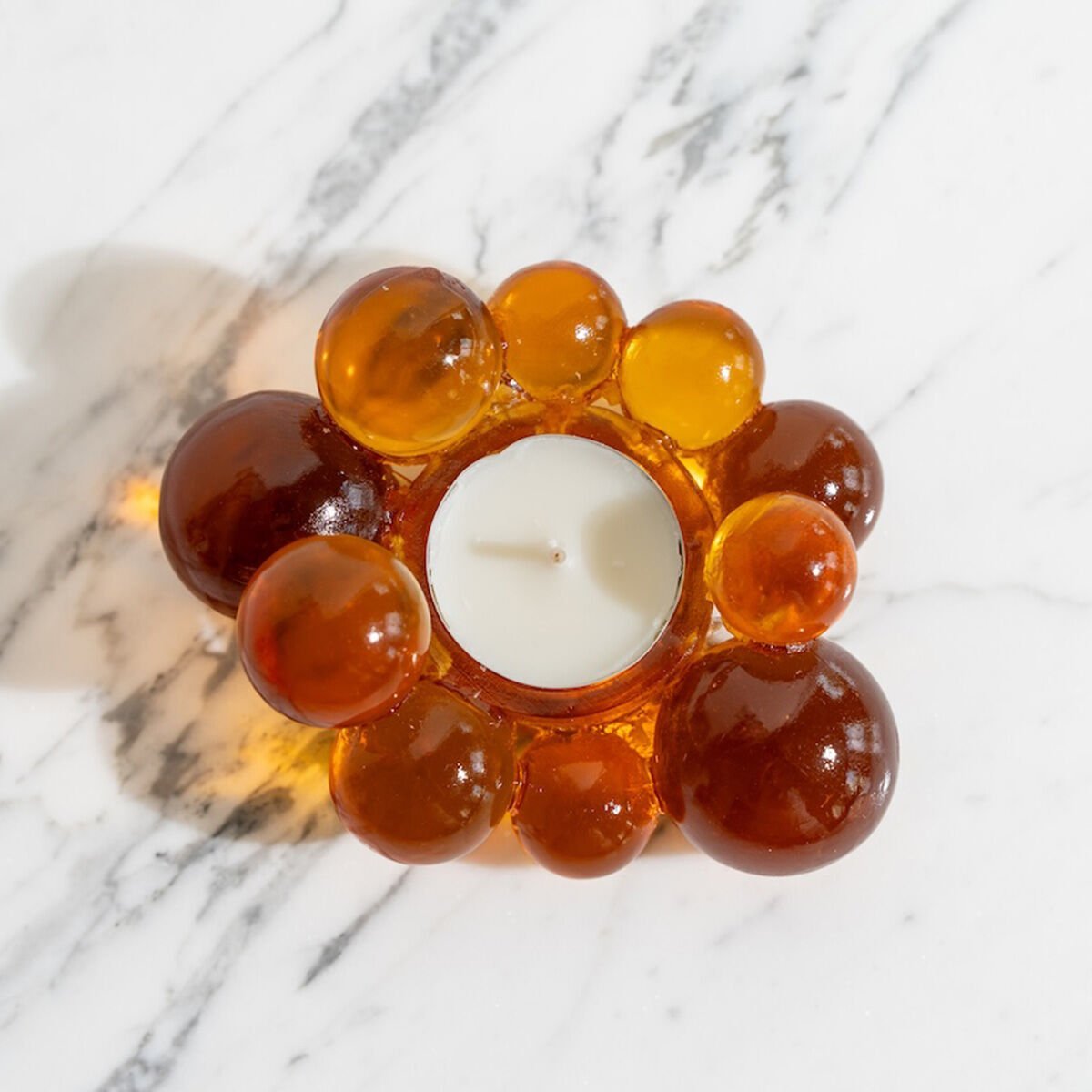 Crafted from amber-colored resin, this candle holder is designed to create a warm and inviting atmosphere in your home.