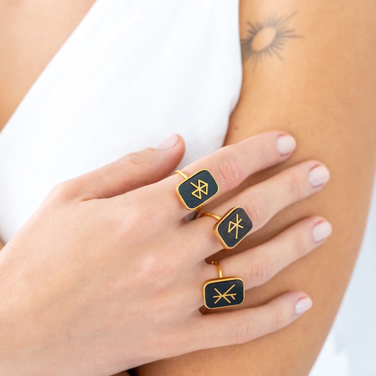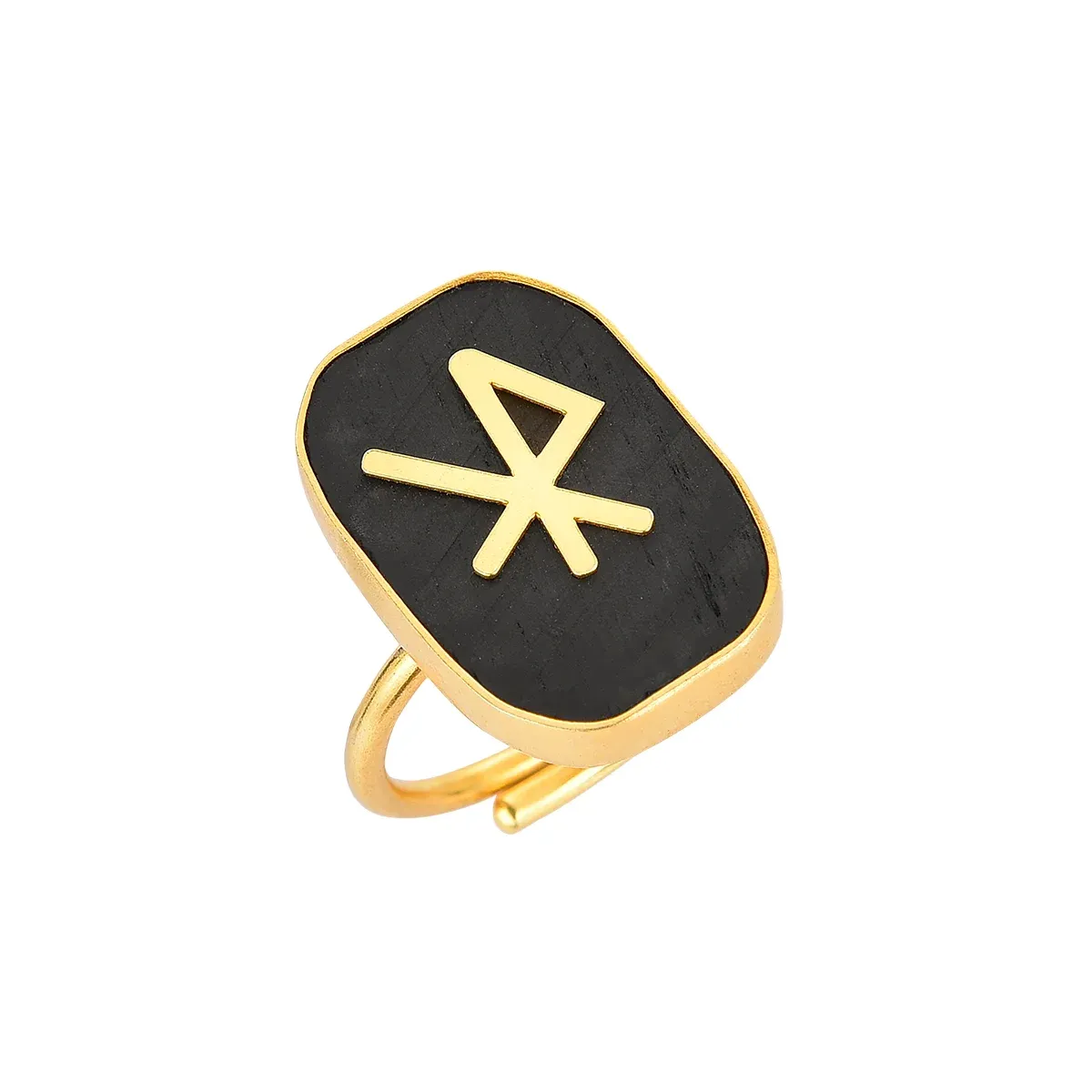 Inspired by the protective and luck-bringing meanings of Viking symbols from ancient Norse culture, this ring is meticulously crafted with Ebony stone and 925 sterling silver plated with gold.