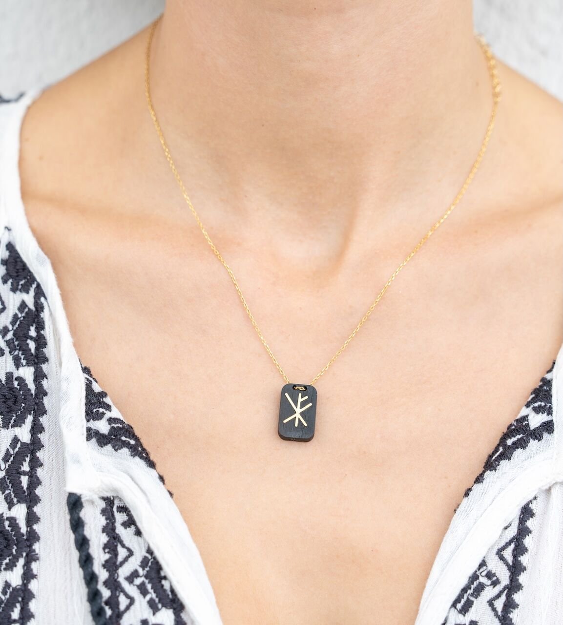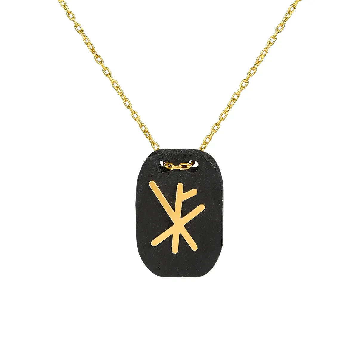 Inspired by the protective and luck-bringing meanings of Viking symbols from ancient Norse culture, this necklace is meticulously crafted with Ebony stone and 925 sterling silver plated with gold.