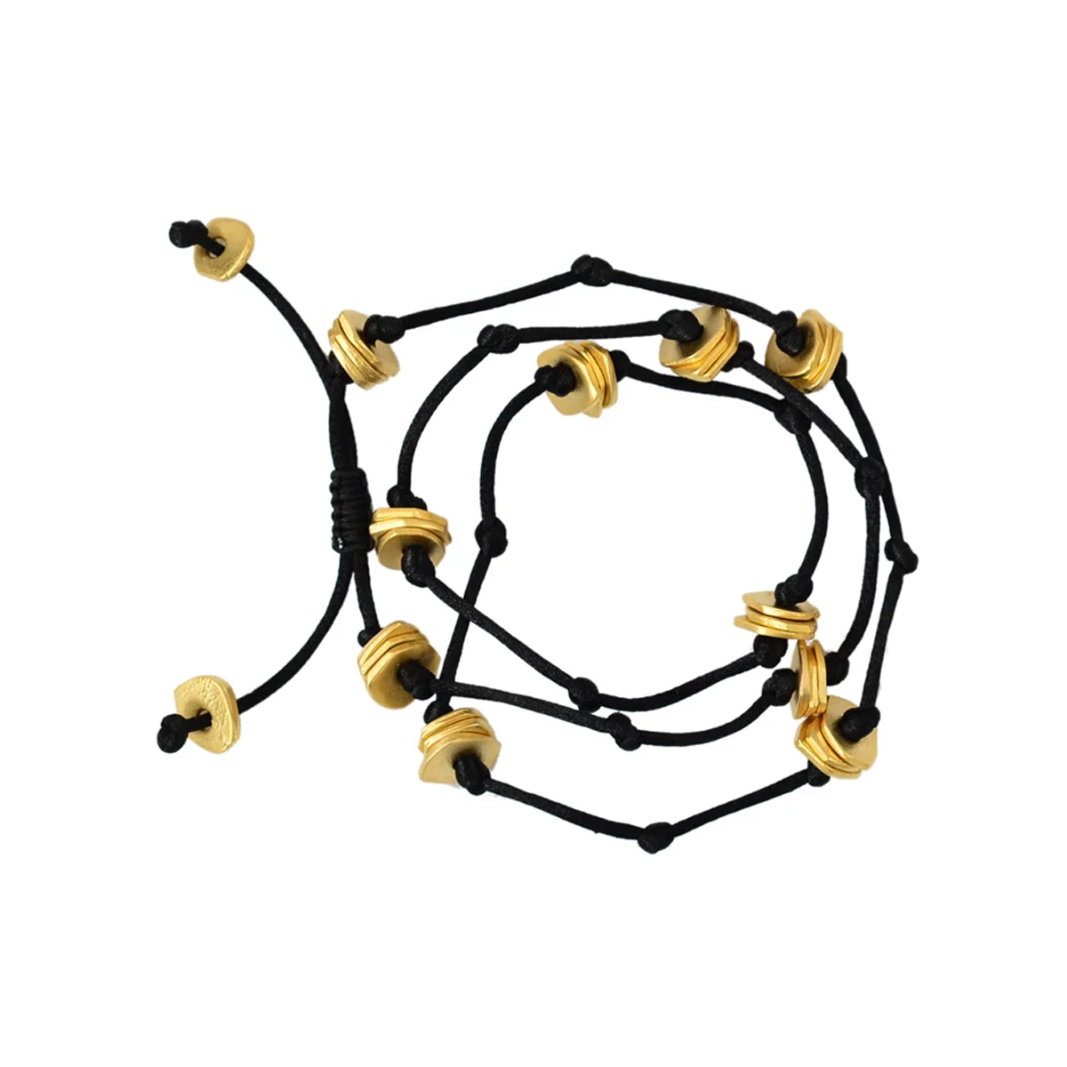Moira Kolye, siyah saten ip ve bronz üzeri altın kaplama malzemeden üretilmiştir.