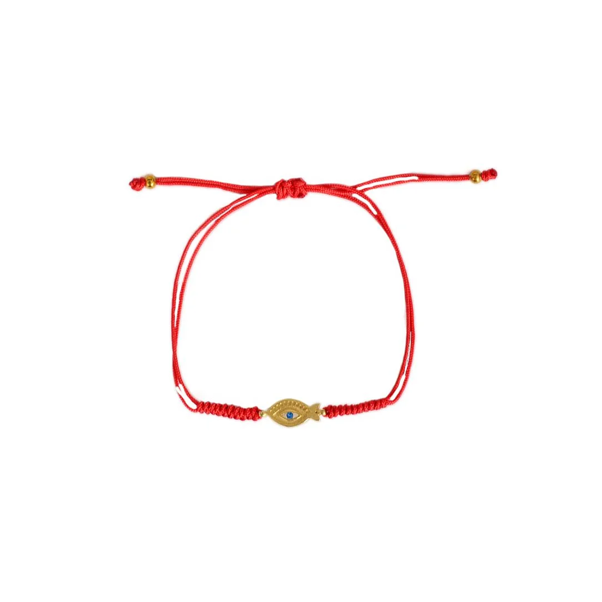 Kırmızı ipli balık göz swarovski turkuaz taş kullanılmıstır. 925 ayar gümüş üzeri altın kaplamadır.