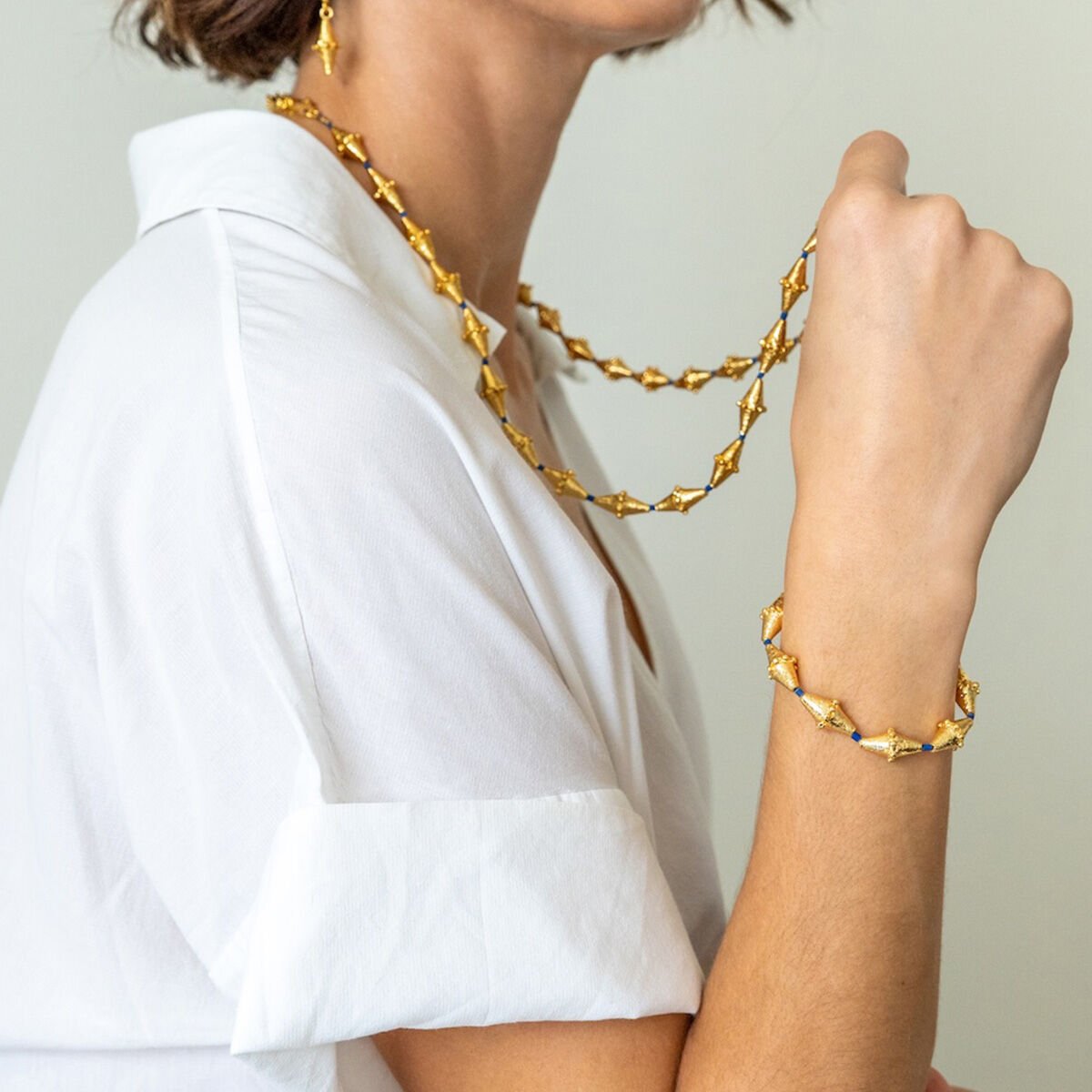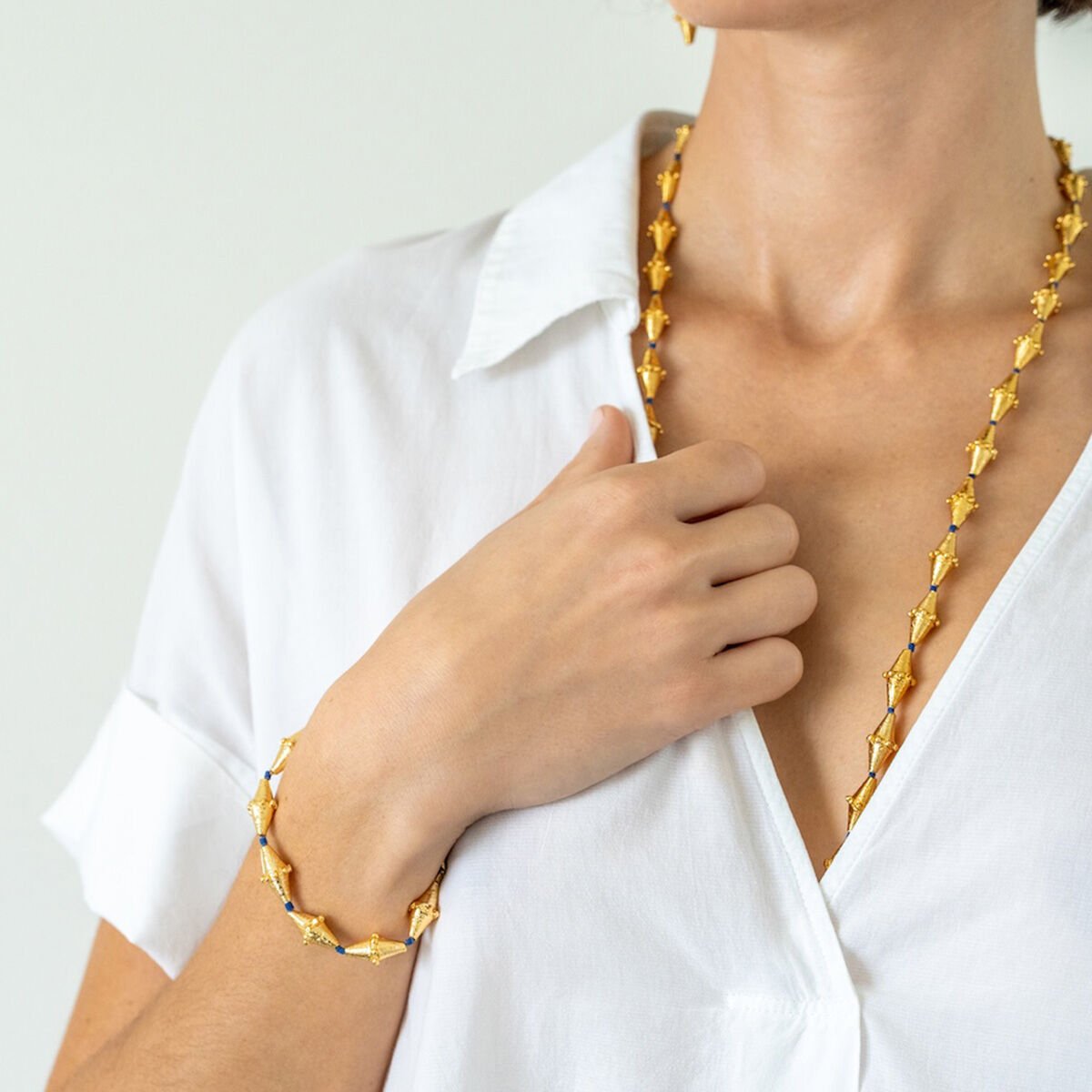 Lüppe kolye, bronz üzeri altın kaplama ve lapis taşlarla üretilmiştir.