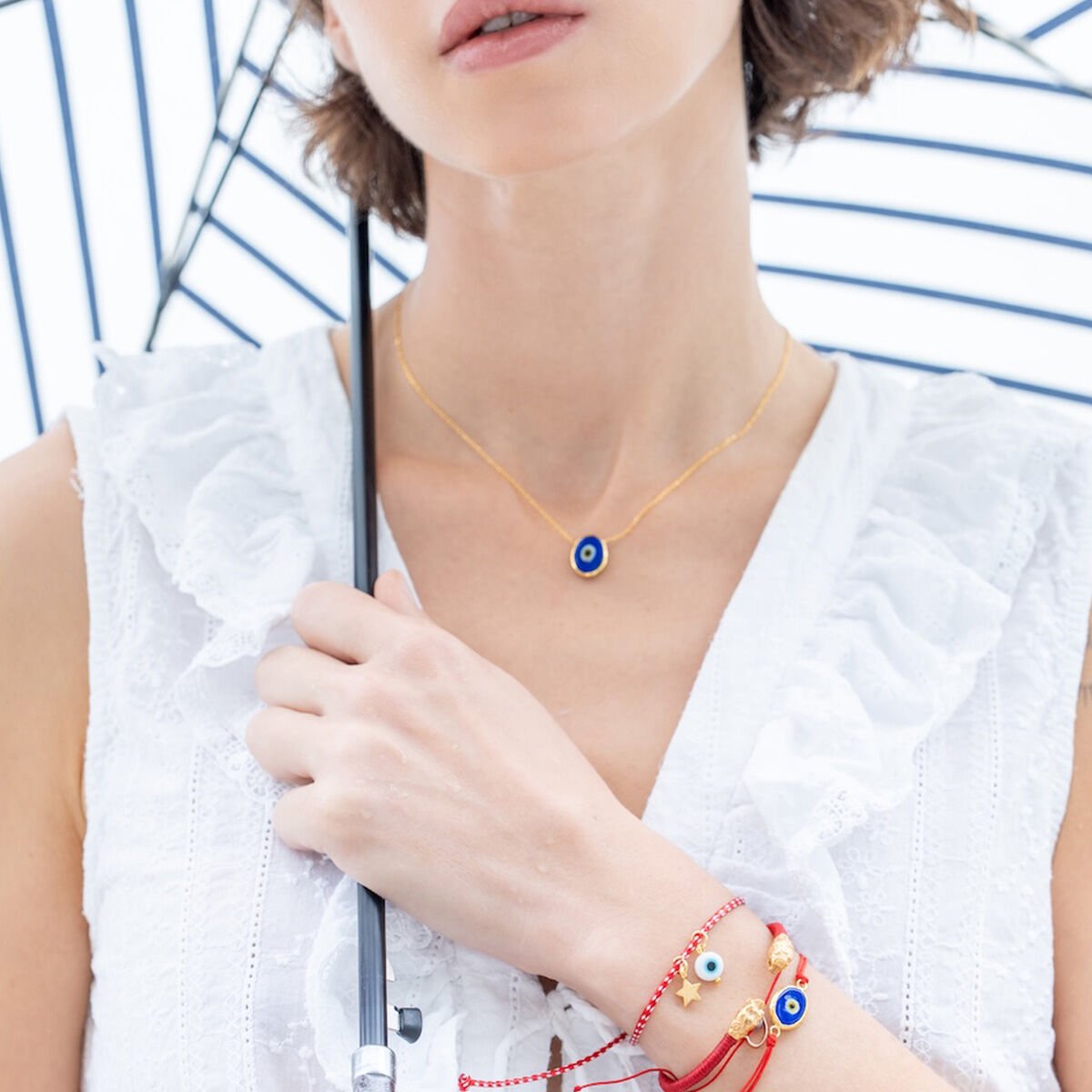 Kötü enerjilerden koruyucu bir tılsım olarak bilinen nazar boncuğu, bu kolyede zarafet ve anlamla buluşuyor.