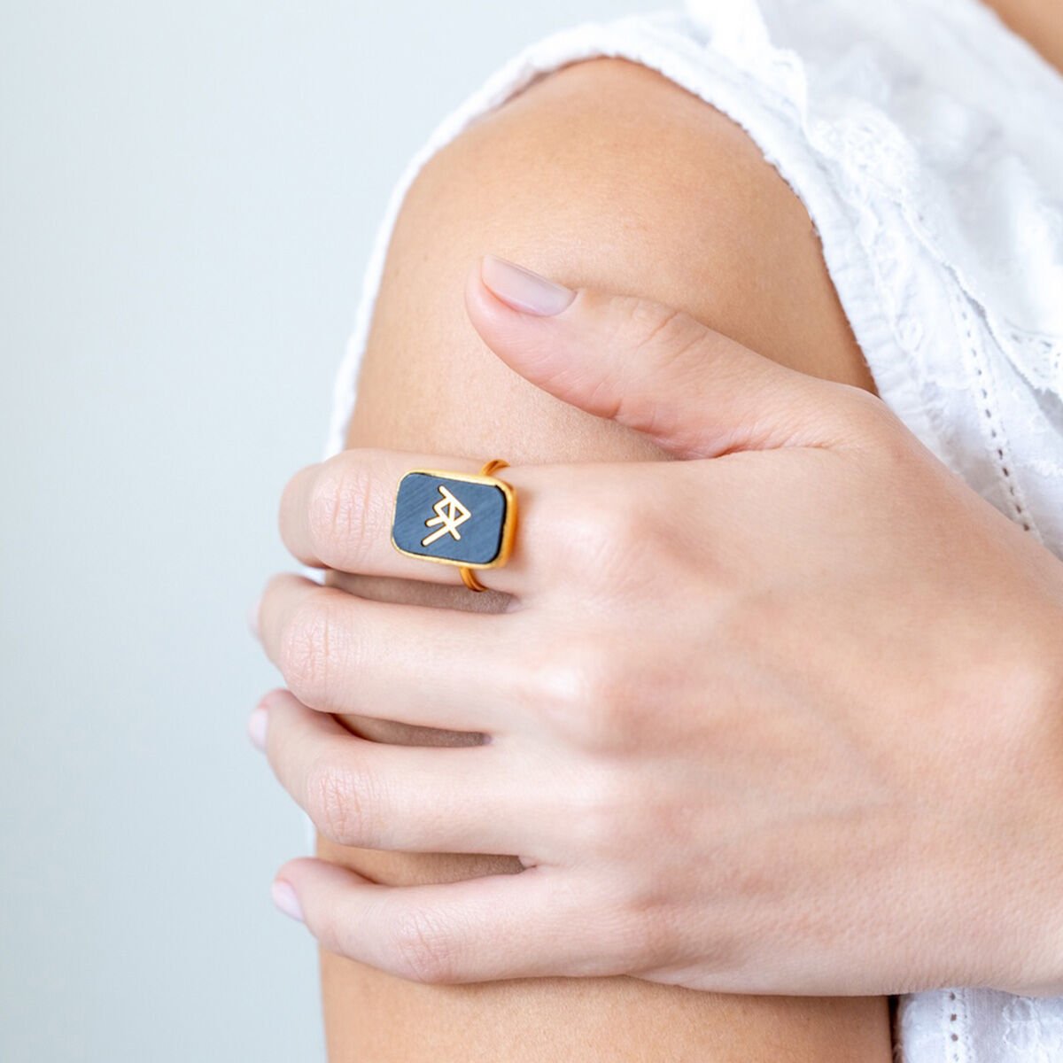 Viking sembollerinin eski İskandinav kültüründeki koruyucu ve şans getiren anlamlarından ilham alınarak tasarlanan bu yüzük, Abanoz taşı ve 925 ayar gümüş üzerine altın kaplama ile özenle üretilmiştir.