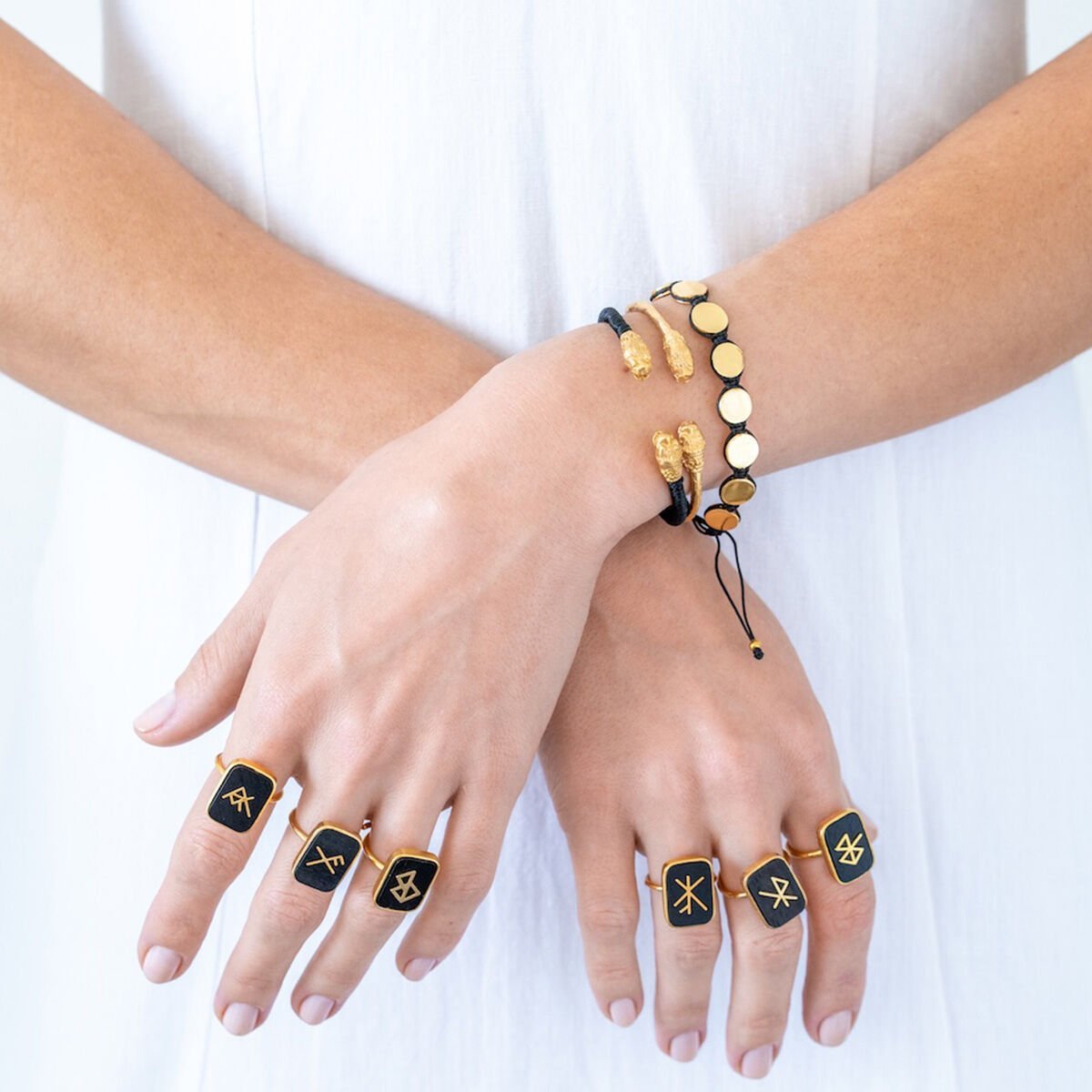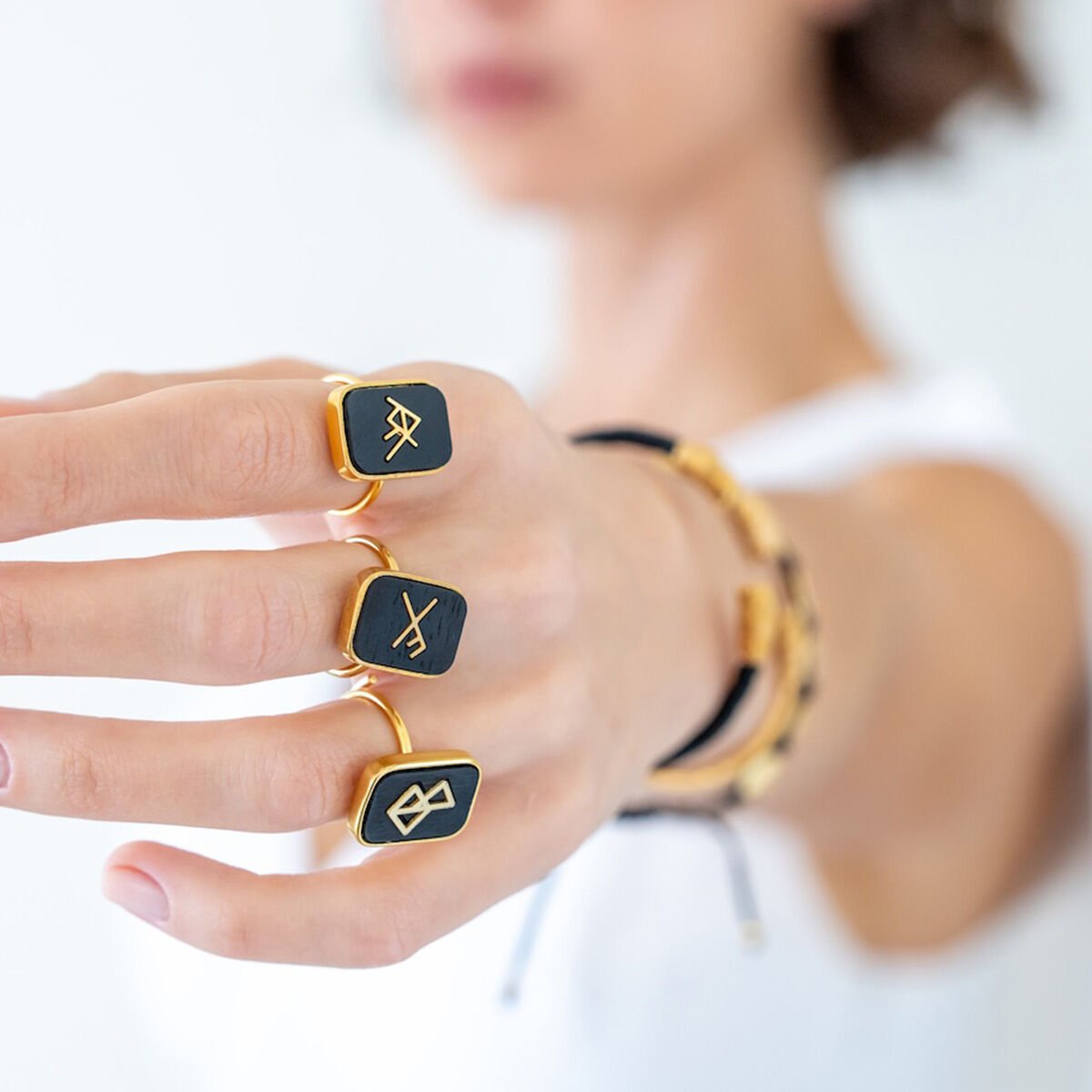 Viking sembollerinin eski İskandinav kültüründeki koruyucu ve şans getiren anlamlarından ilham alınarak tasarlanan bu yüzük, Abanoz taşı ve 925 ayar gümüş üzerine altın kaplama ile özenle üretilmiştir.