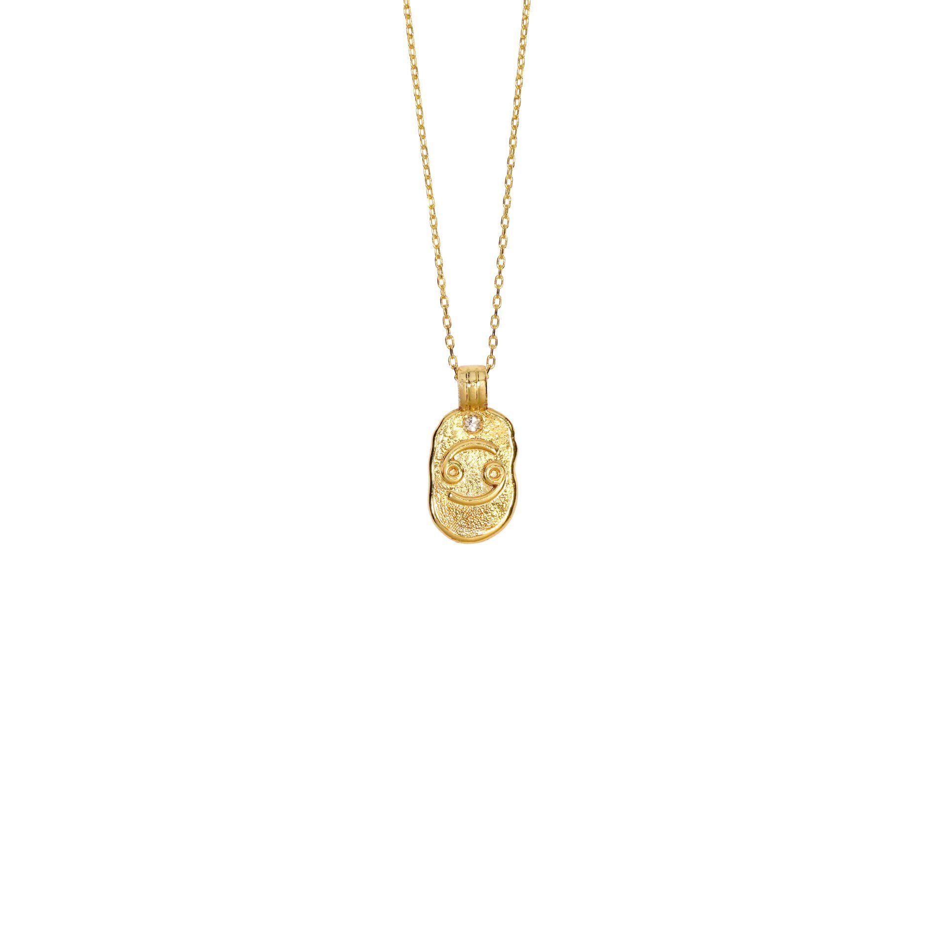 Duygularıyla hareket eden aile ve sevdiklerine düşkünlüğü ile bilinen Yengeç burçları için tasarlanan kolyede bronz ve gümüş üzeri altın kaplama ile Swarovski taş kullanılmıştır.